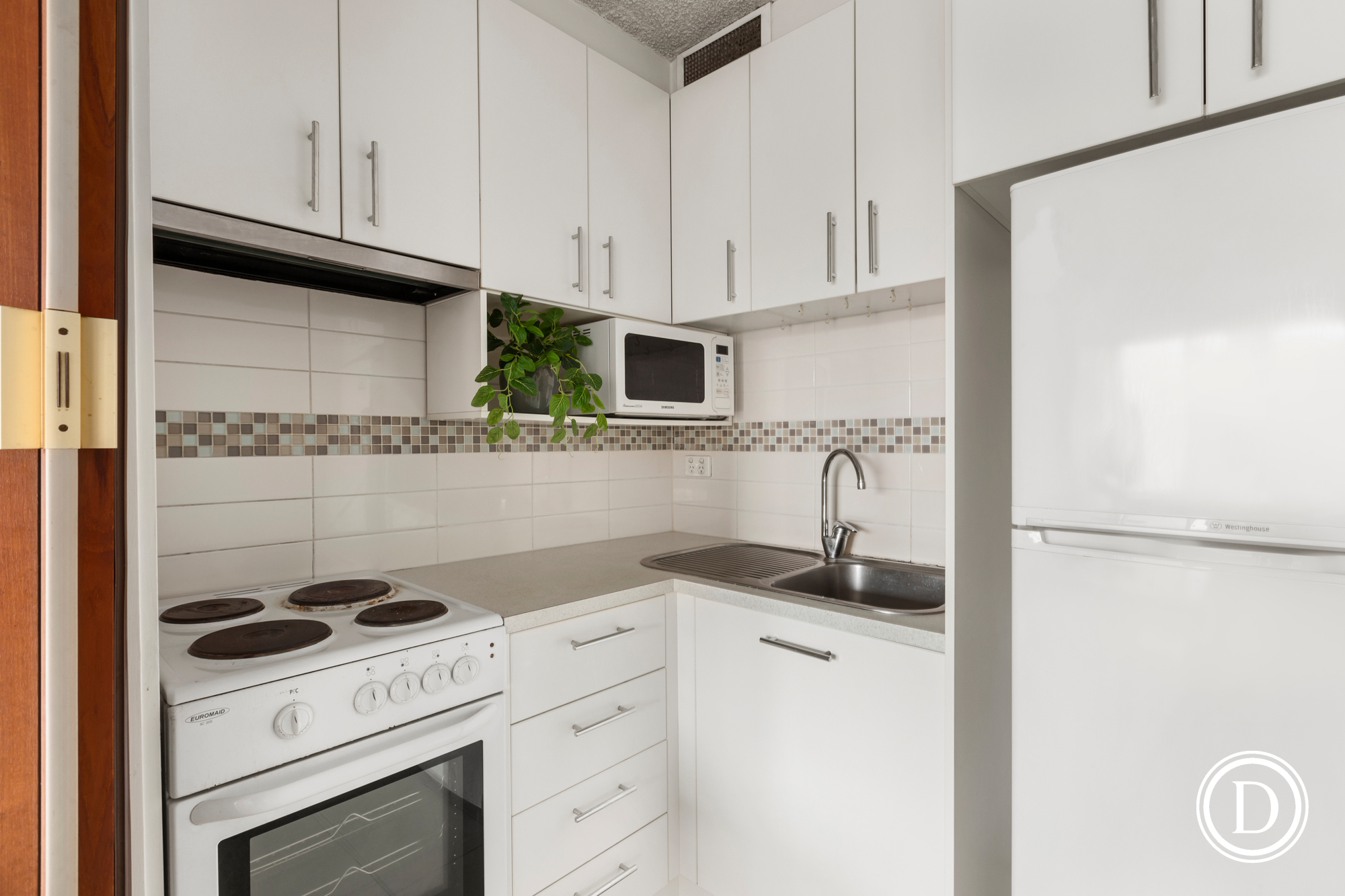 After a quality renovation, this unique apartment comprises a well-equipped kitchen with electric stove and good storage which has been cleverly designed to maximise space, plus a large open-plan living and dining area. The large windows framing the lovely aspect also ensures lots of natural light, this is bright and airy.