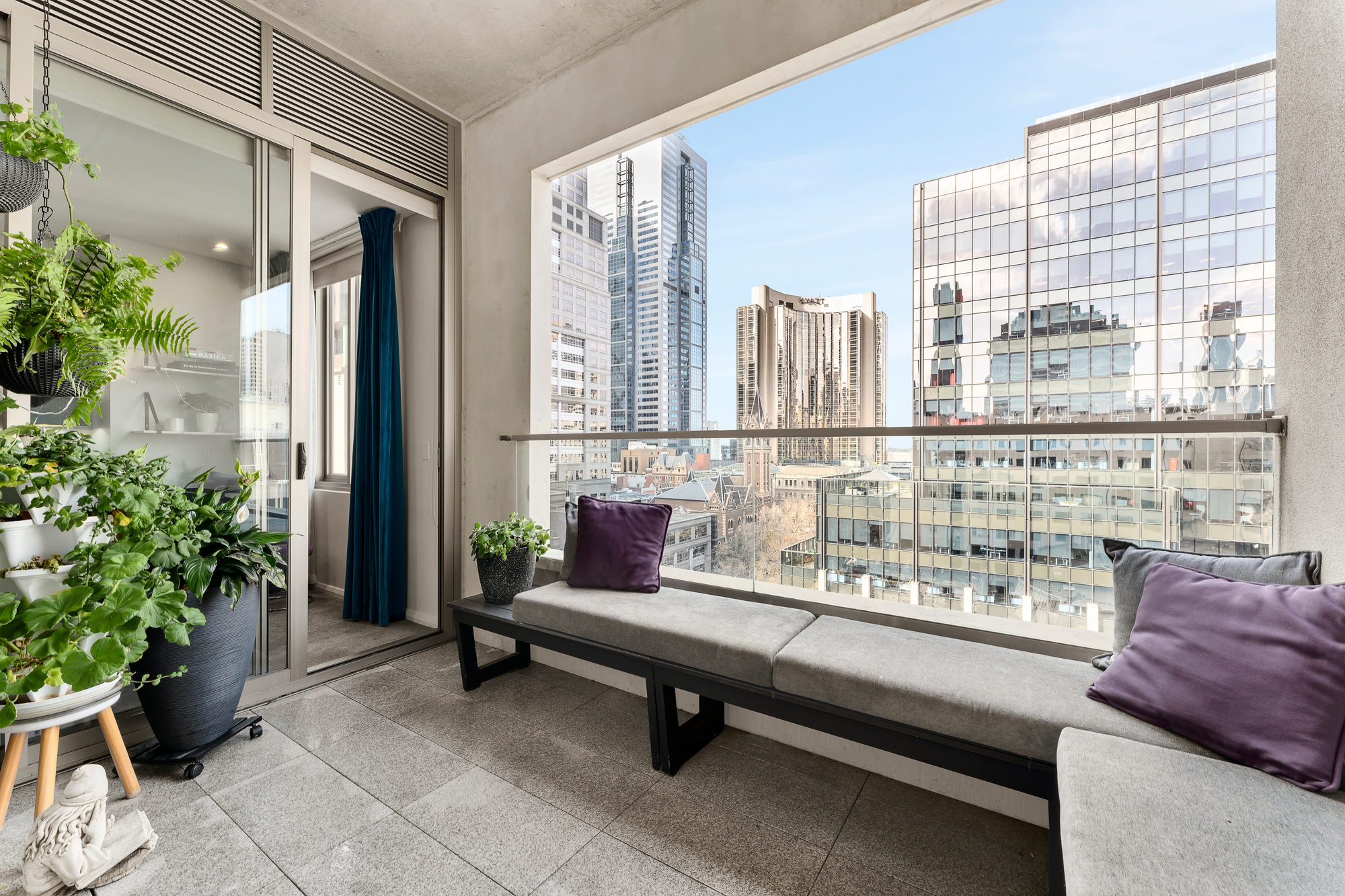 The generous living area with Oak engineered timber floors leads through floor-to-ceiling glass doors that recess to open right up, allowing a seamless indoor/outdoor experience to enjoy the entertainer-sized covered balcony with a lovely leafy aspect, which takes in St. Michael's Church, Russell Street, Government House, and gardens. Cocktails with friends here are going to be a constant. Or have the bar of your choice within the hotel make them for you and simply deliver them to your door.