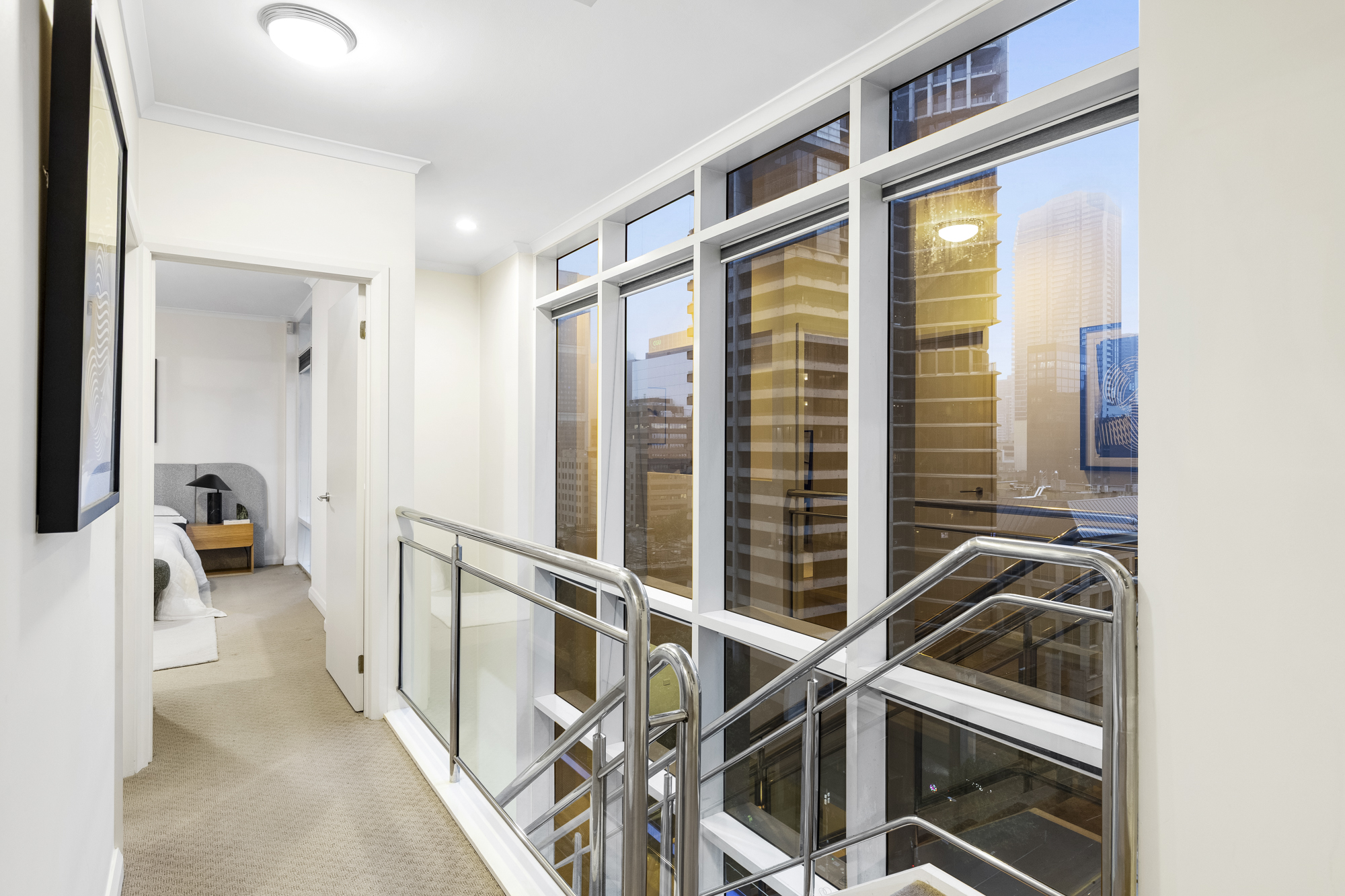 A sculptural spiral staircase leads to the showpiece rooftop terrace — a truly unique offering in CBD apartment living. Here, a built-in BBQ and second kitchenette set the stage for unforgettable gatherings, all framed by sweeping views down Queen Street and La Trobe Street. Whether hosting large celebrations or enjoying an intimate evening under the skyline, this rooftop sanctuary delivers an experience few apartments can rival.
