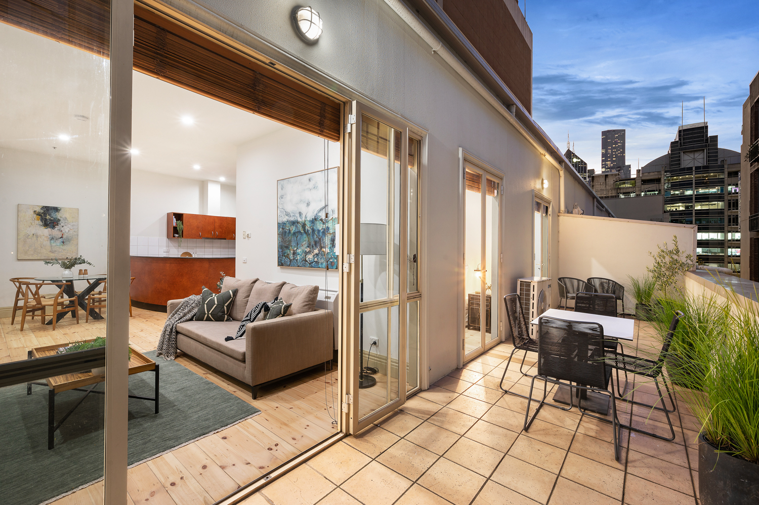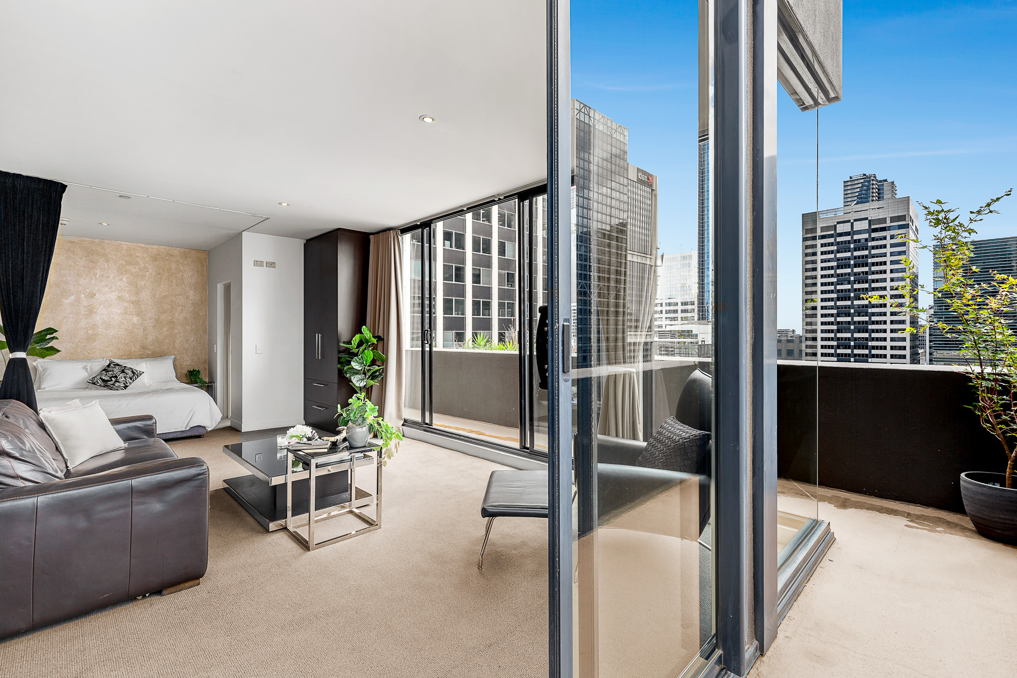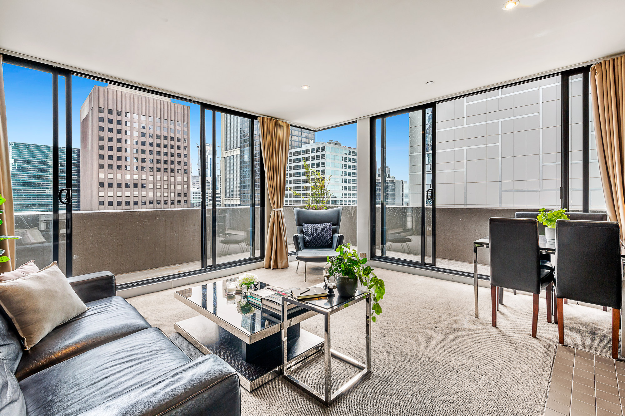 With its North/Eastern orientation, the winter sun simply fills the living room and warms you. Floor to ceiling windows and glass sliding doors frame the New York style City aspect. The transition from day to night is sublimely embracing the City night lights. The wrap-around balcony is fabulous and the pièce de résistance, a huge knock out private terrace too for those who enjoy serious entertaining.
