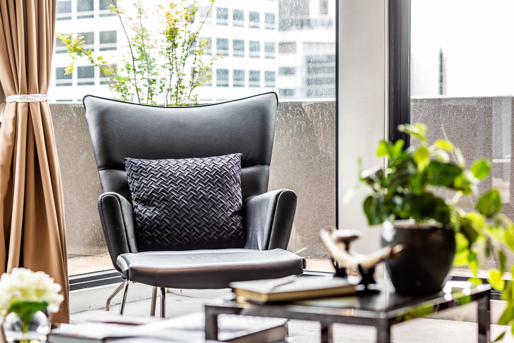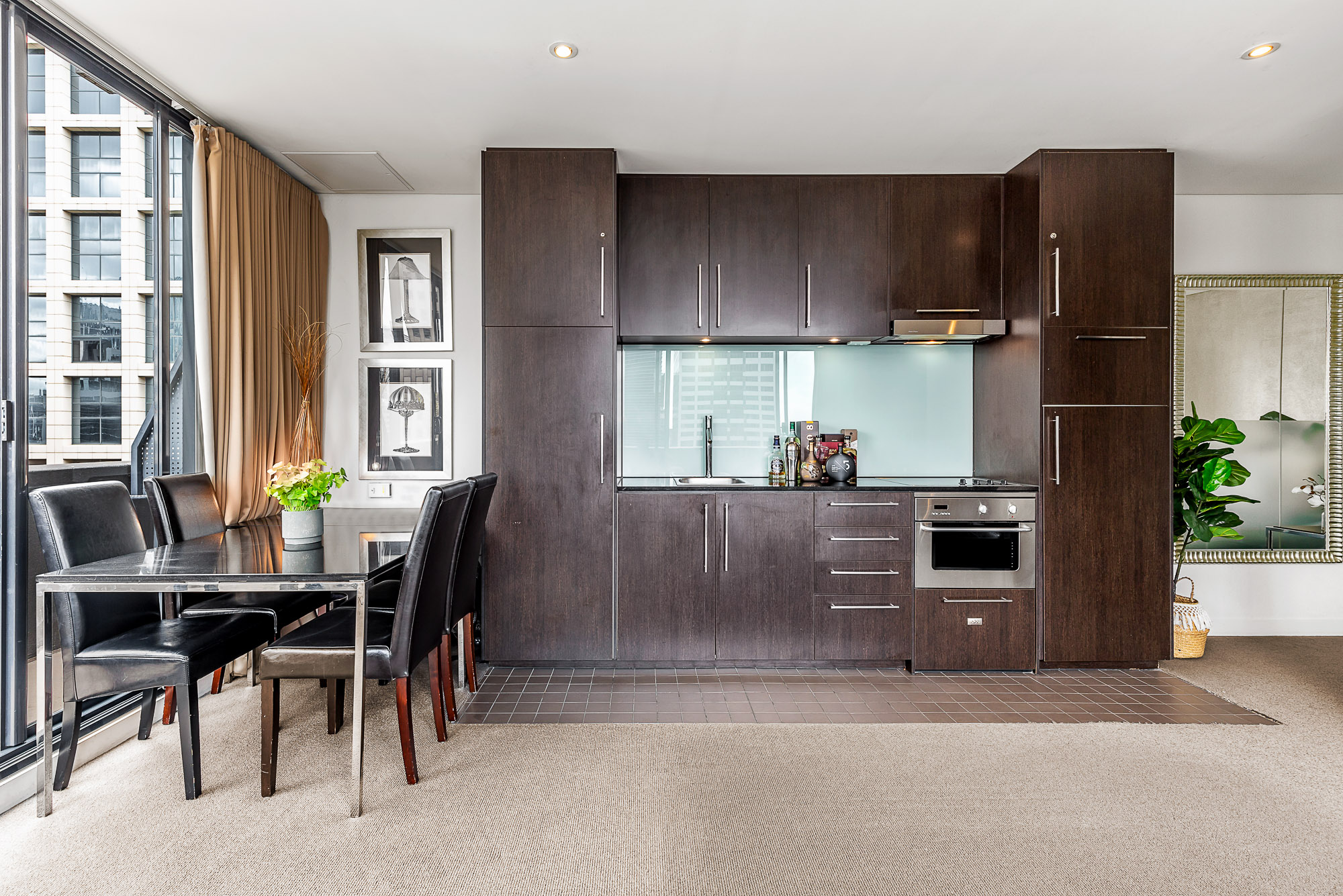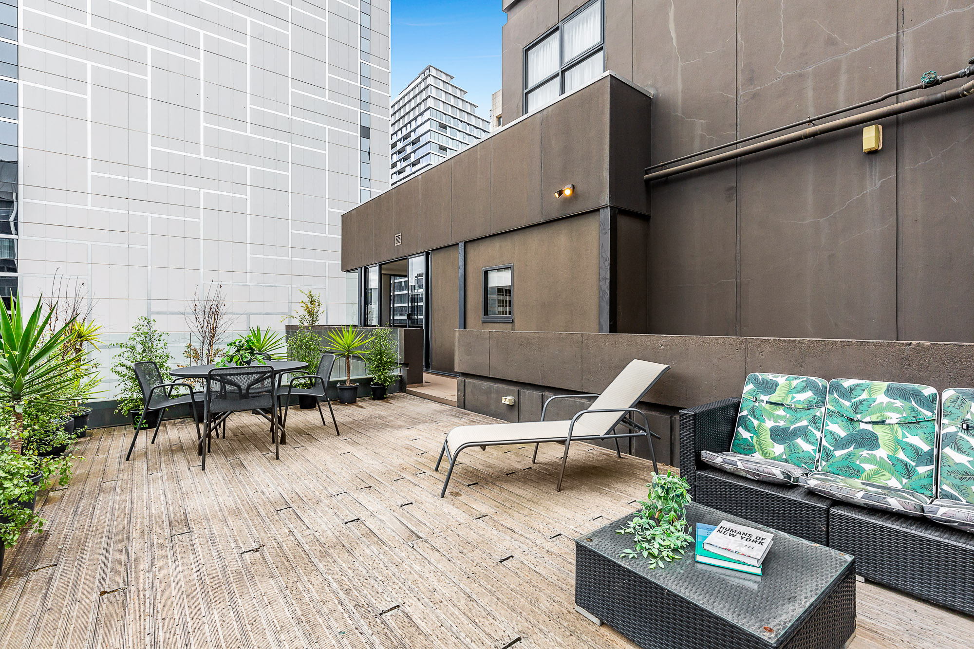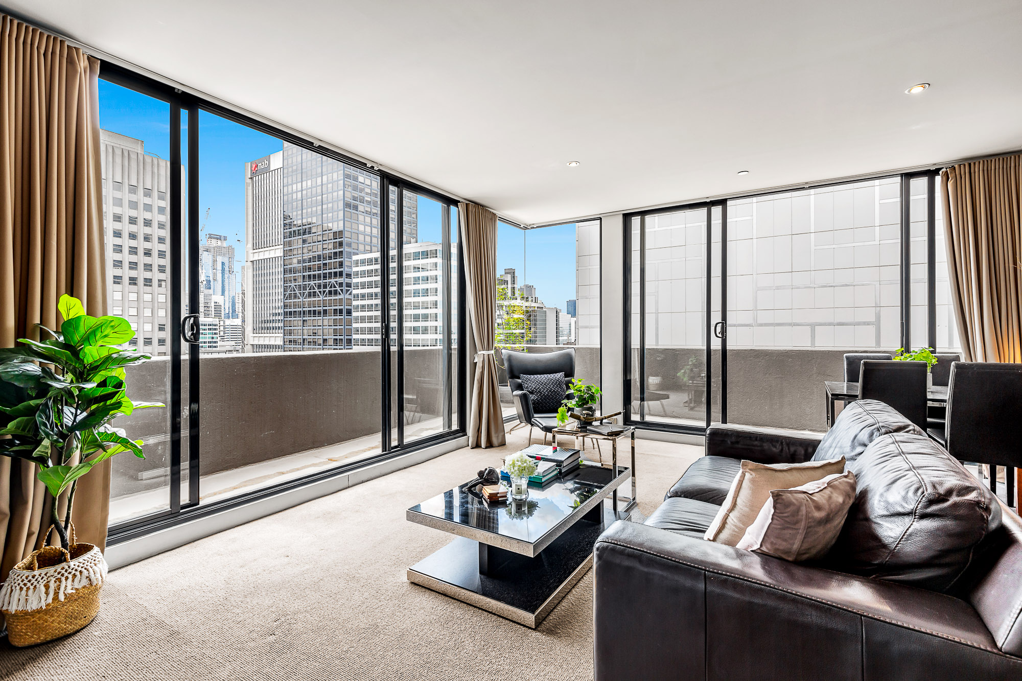 With its North/Eastern orientation, the winter sun simply fills the living room and warms you. Floor to ceiling windows and glass sliding doors frame the New York style City aspect. The transition from day to night is sublimely embracing the City night lights. The wrap-around balcony is fabulous and the pièce de résistance, a huge knock out private terrace too for those who enjoy serious entertaining.