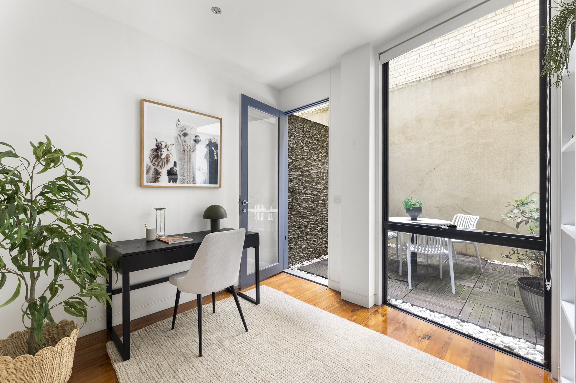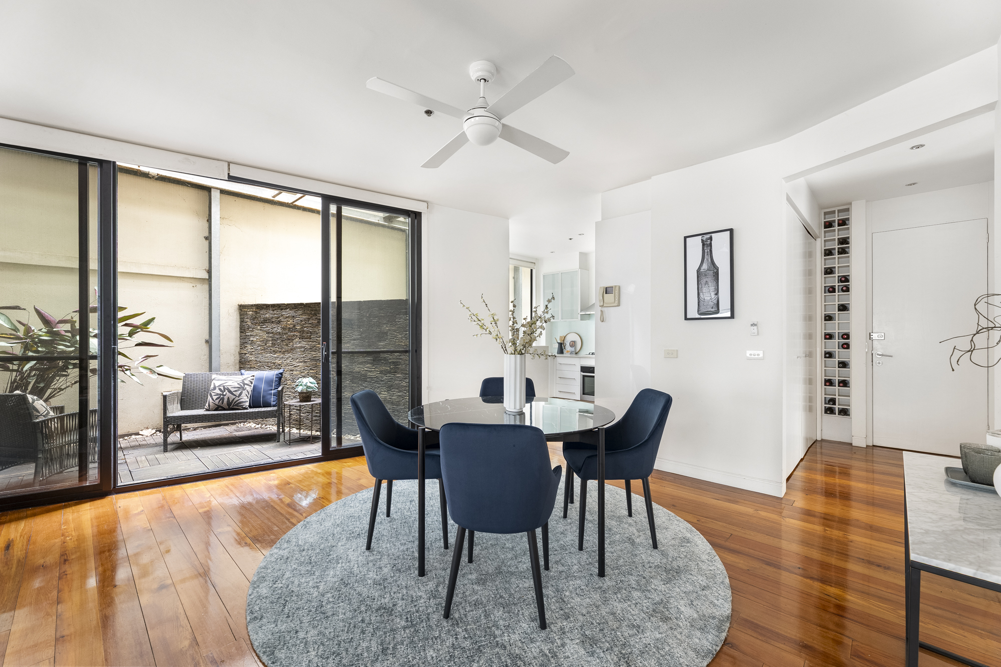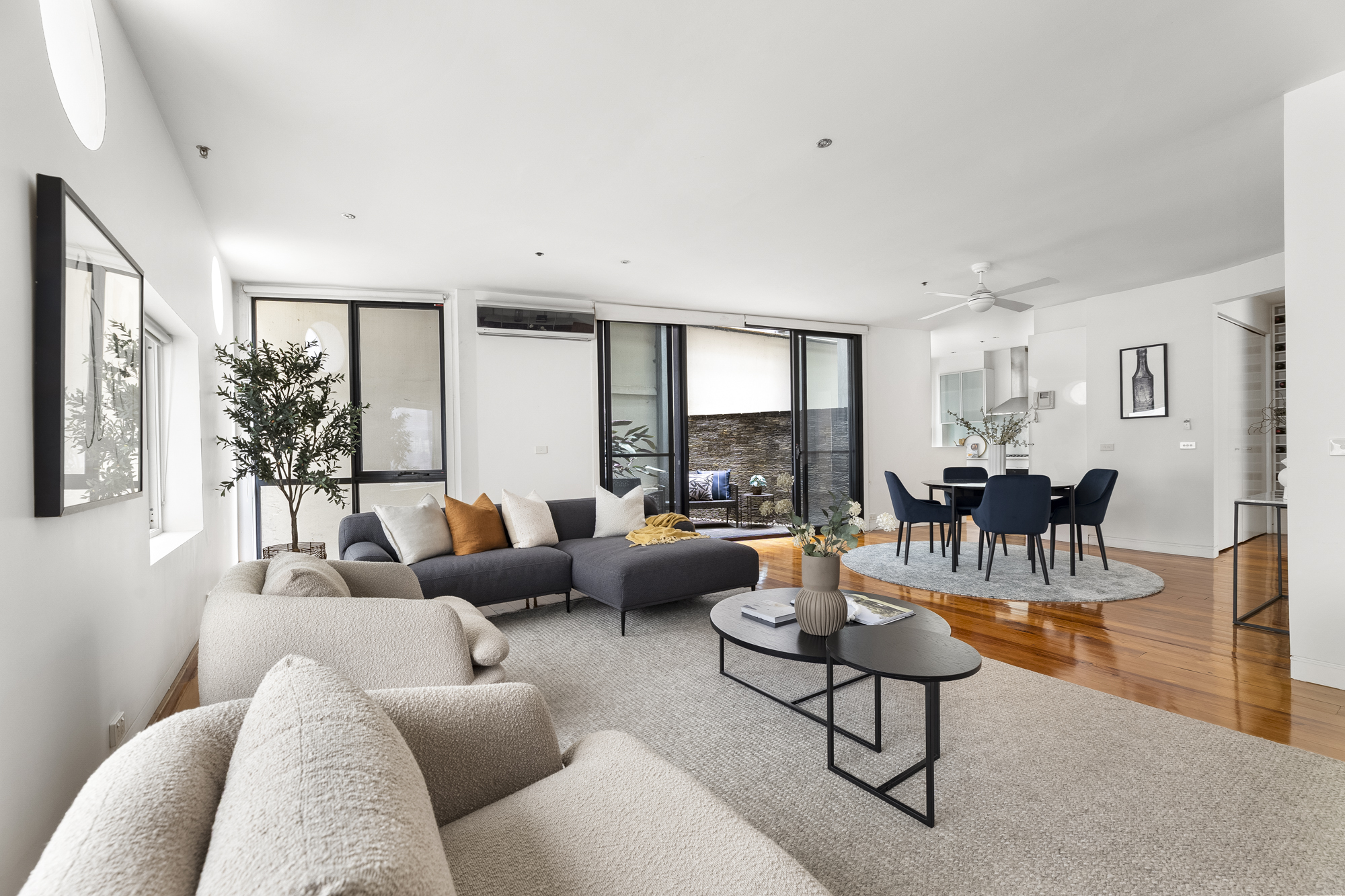 Beyond its understated entrance, the home reveals itself with assured elegance. Original polished timber floors anchor the interiors beneath impressive ceiling heights, while the open-plan living and dining zone delivers remarkable scale and flexibility — a rarity within the CBD. Natural light moves gently across textured finishes, creating an atmosphere that feels rich in heritage yet perfectly attuned to modern living.