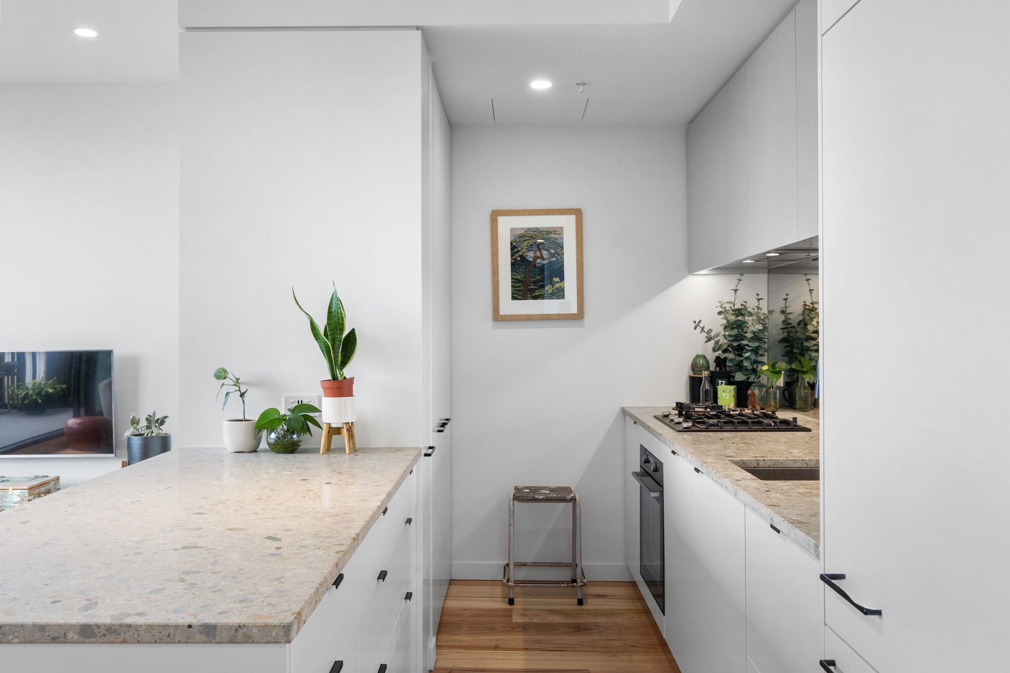 • A sleek, entertainer’s kitchen with stone benchtops, stainless steel appliances, mirrored splashback, and abundant storage.