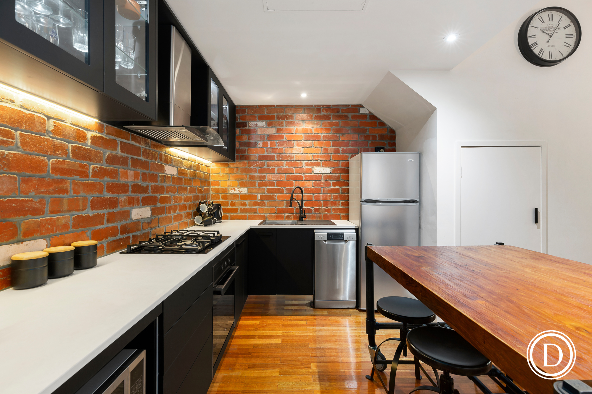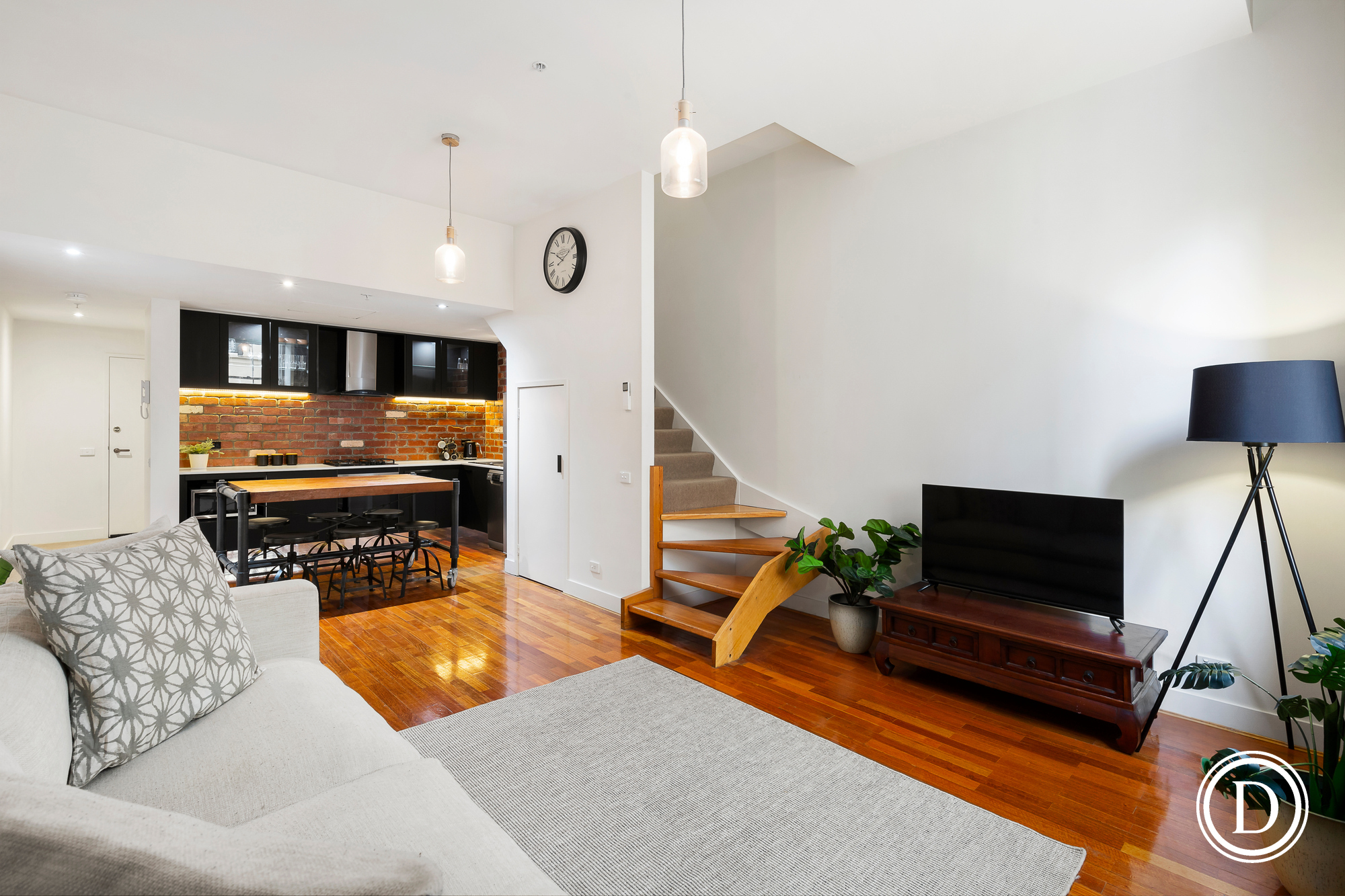 Downstairs you enjoy a stunning Dark Silhouette Gourmet kitchen that truly compliments the chic warehouse style and will delight those who love to cook. Living room also downstairs and so too a laundry and bathroom.