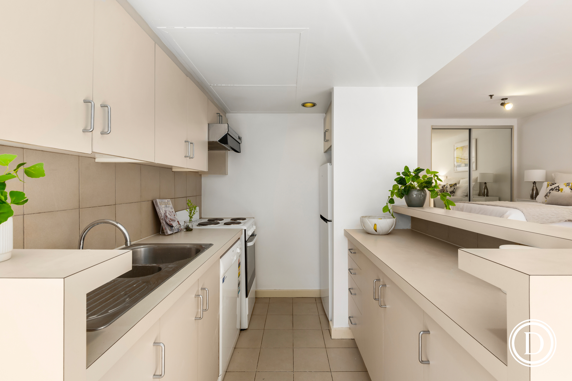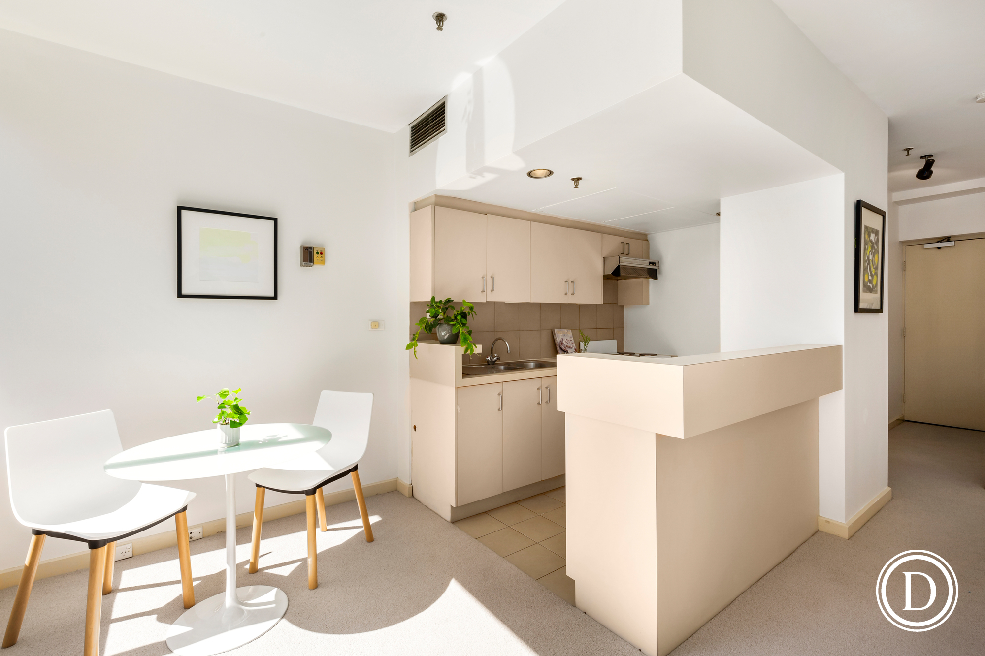 Saturated in natural light with east facing wall to wall windows capturing the glorious morning sun and overlooking the leafy private gardens for the residents. A lush oasis filled with birdsong for your use and enjoyment. A full kitchen and bathroom ensure you have all the comforts you need. Fully airconditioned.