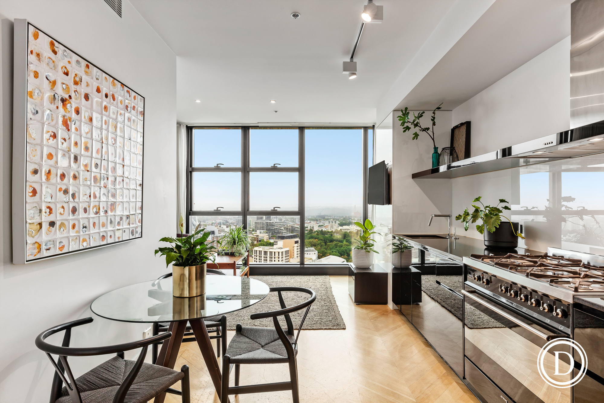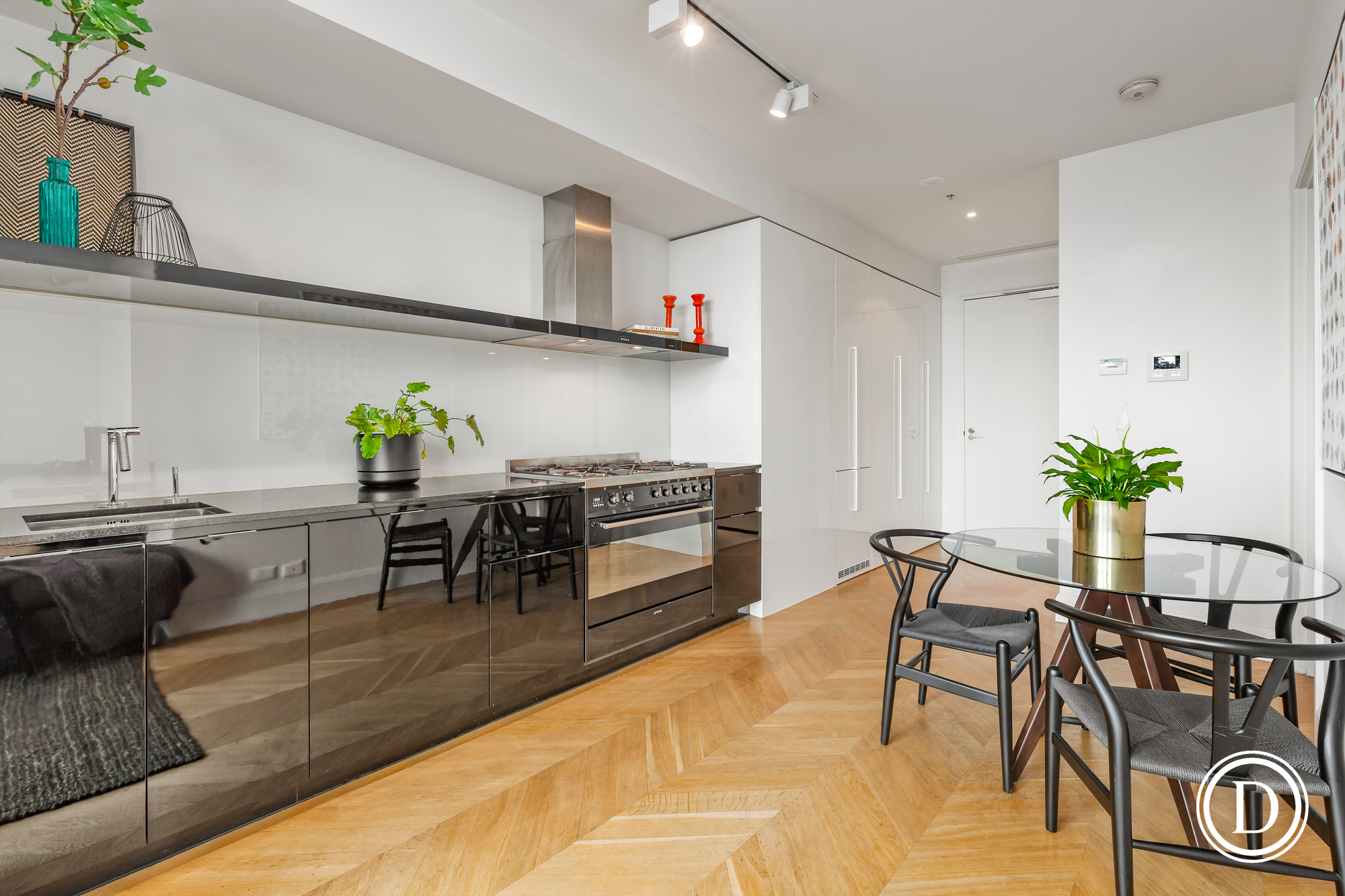 Featuring Herringbone solid oak flooring which flows through to the state of the art stone kitchen with soft-closing drawers, top quality stainless steel Smeg appliances, including a 6-burner cooktop, integrated dishwasher and Integrated fridge/freezer and fabulous easy living open plan living with floor to ceiling picture windows.