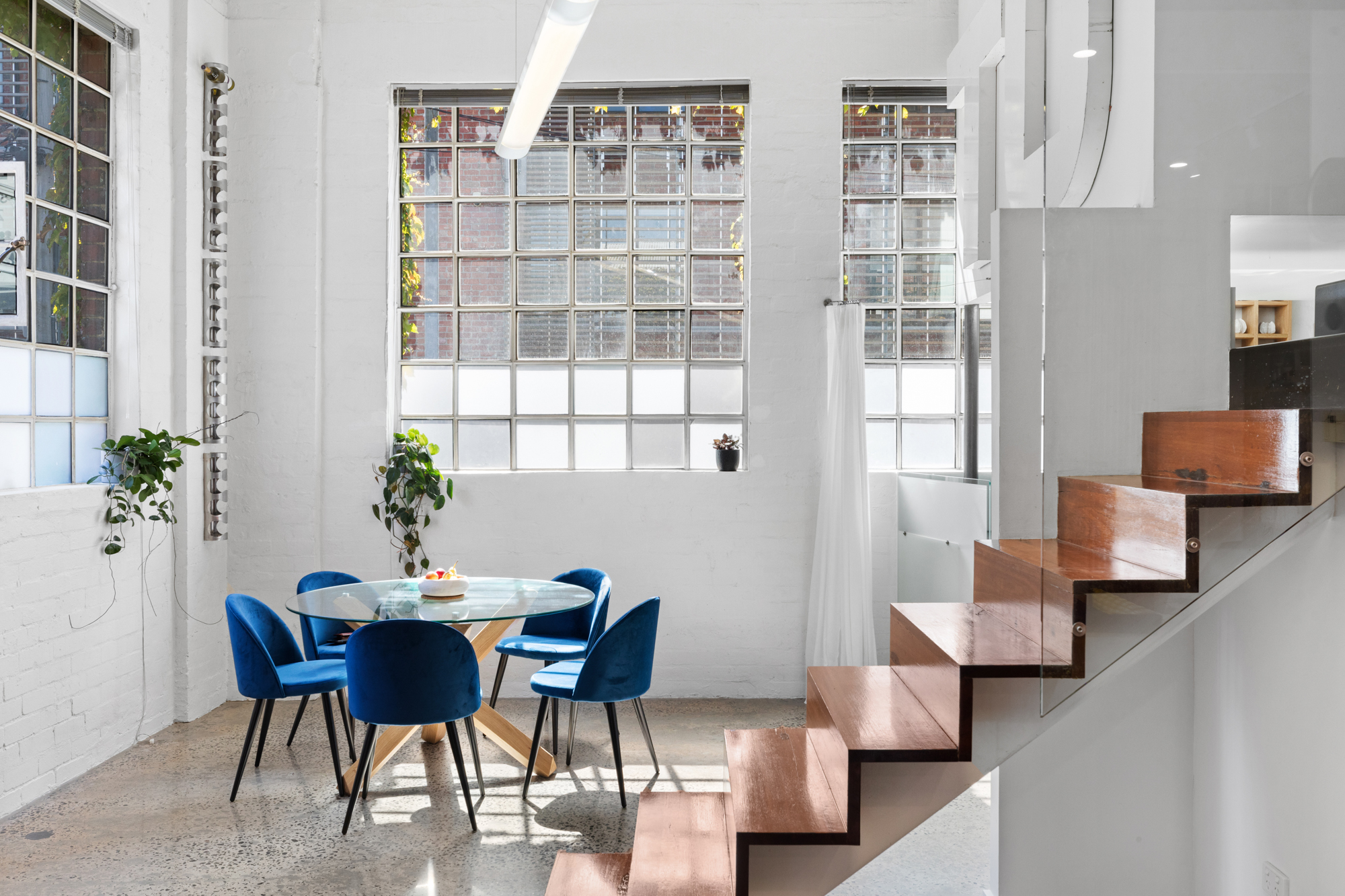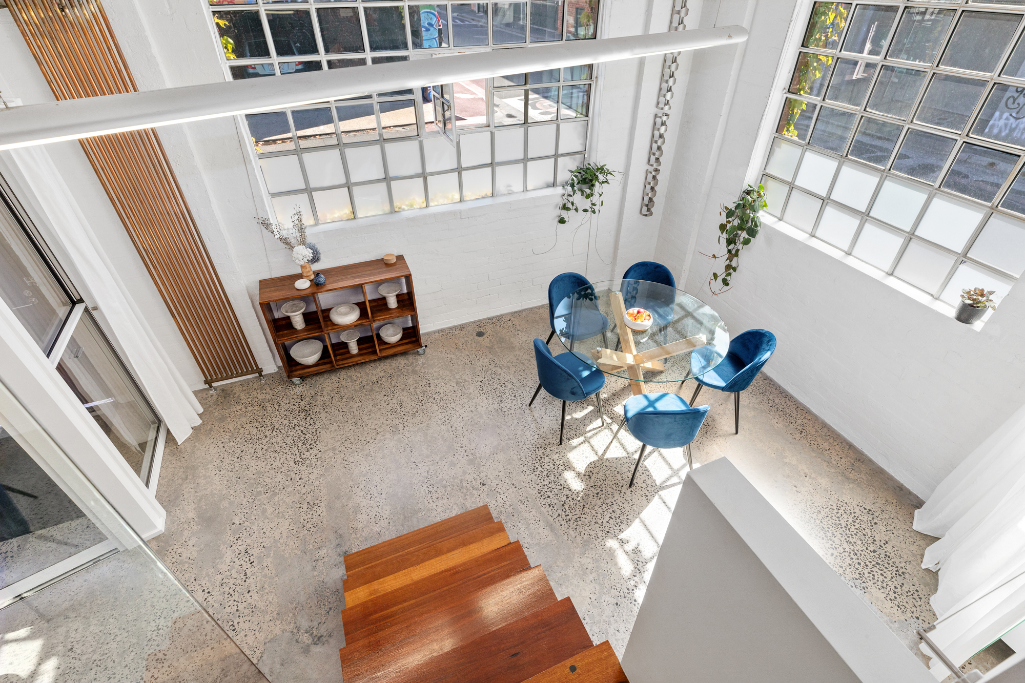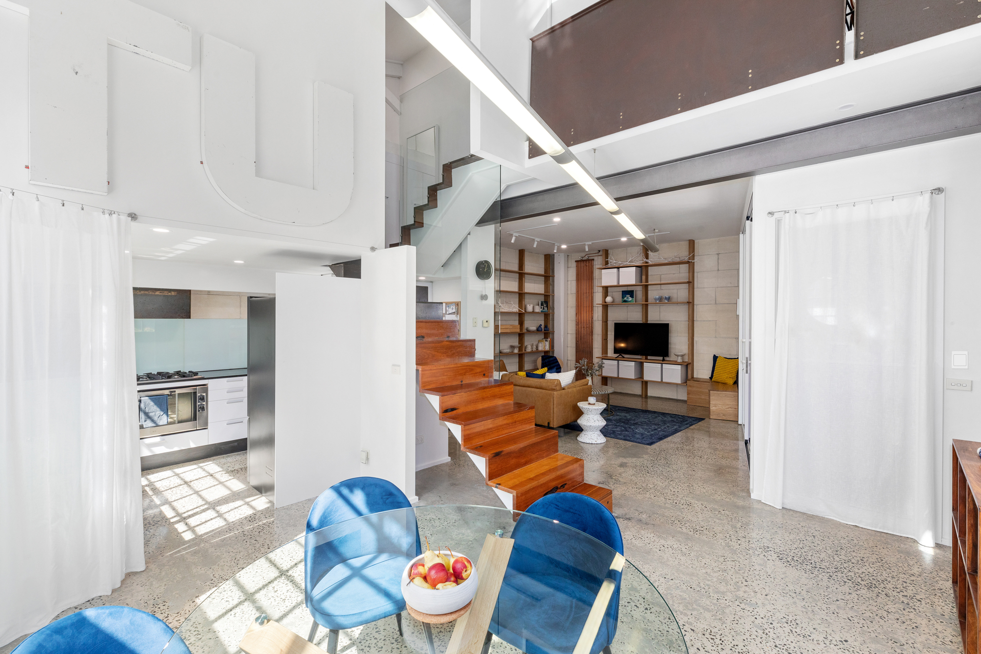 Recently refurbished to exacting standards this property stuns with polished concrete floors, custom oak shelving and tailored double-glazed sliding doors creating the ultimate indoor-outdoor living zone. Retaining elements of the former textile factory - deep North-facing windows, soaring ceilings and roof trusses - this ultra-stylish property opens from a private courtyard to expansive living and dining zones separated by a well-equipped kitchen with granite benchtops, premium appliances including gas cooking and dishwasher, and concealed laundry fitted with washing machine and dryer. Limestone walls and vertical copper hydronic heating units enhance the appeal of this dramatic space. Timber stairs ascend to two large bedrooms - second bedroom mezzanine-style, the perfect home office- both with external windows and timber BIRs, plus a smart bathroom with shower-over-bath.