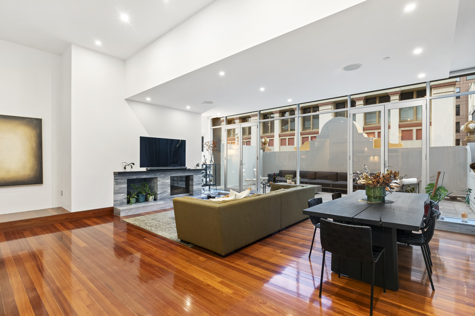 The main living and entertaining area captures natural light through expansive glazing, opening to a generous southern terrace framed by the building’s timeless façade. Also showcased is a gourmet kitchen appointed with stainless steel, stone, and mosaic finishes, Miele and Smeg appliances, gas cooking, an integrated refrigerator, and ample storage. Thoughtfully designed bi-fold doors ensure superb acoustic privacy while creating a seamless indoor–outdoor connection.