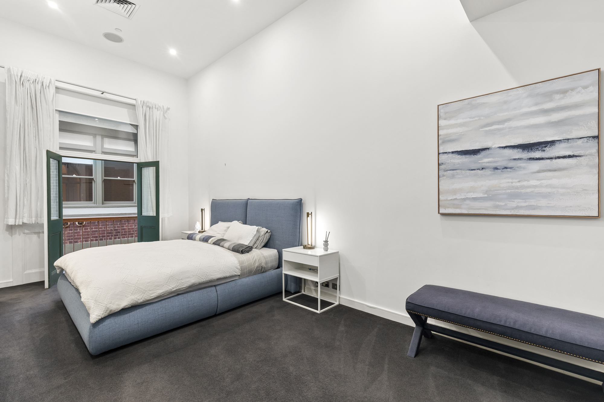 Upon entry, a grand spiral staircase with centrepiece pendant sets the tone for what’s to come. The first floor hosts a serene and spacious master suite complete with extensive robes, a lavish ensuite featuring a spa bath, and a private balcony retreat overlooking quiet Bligh Place.