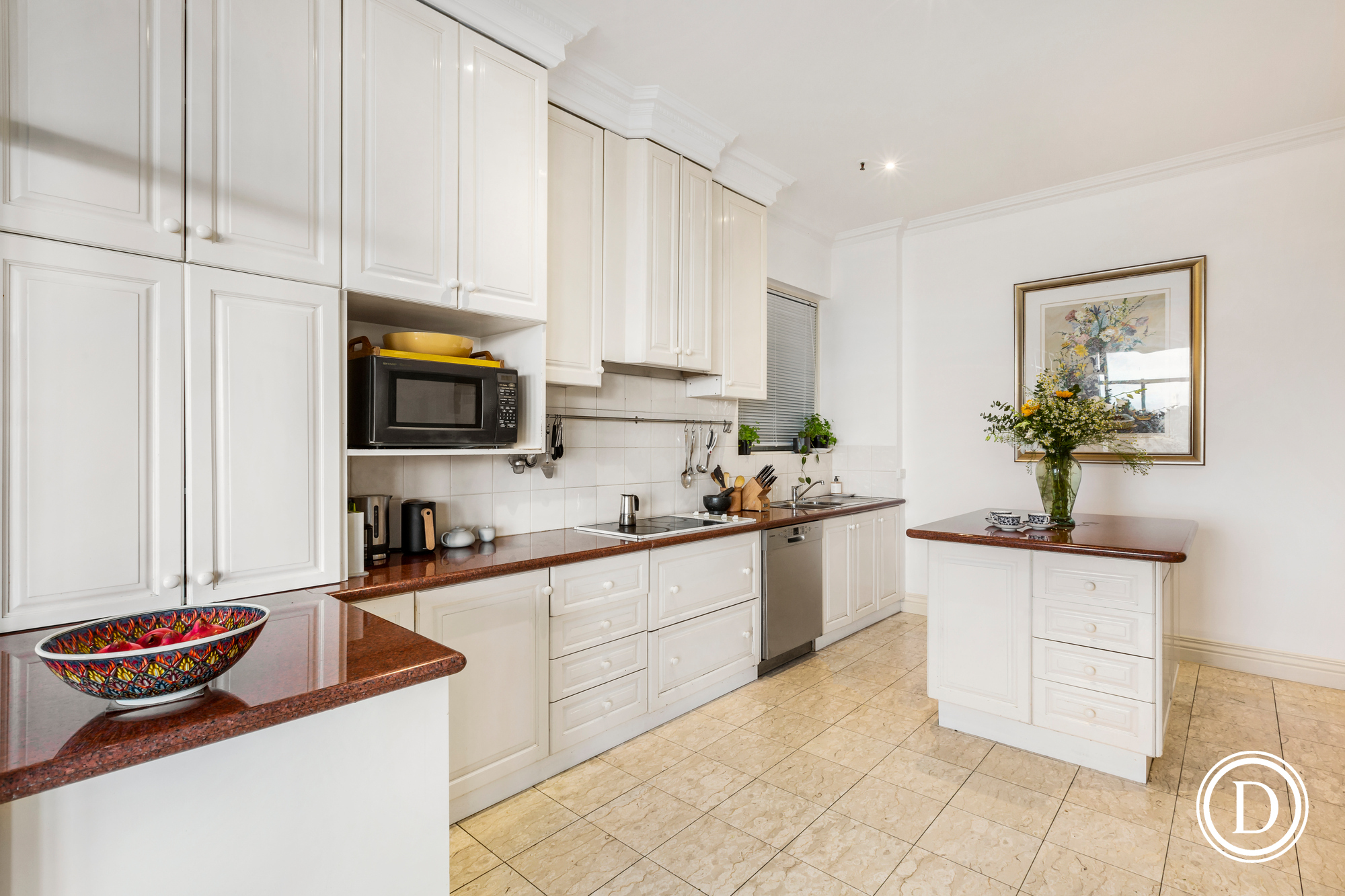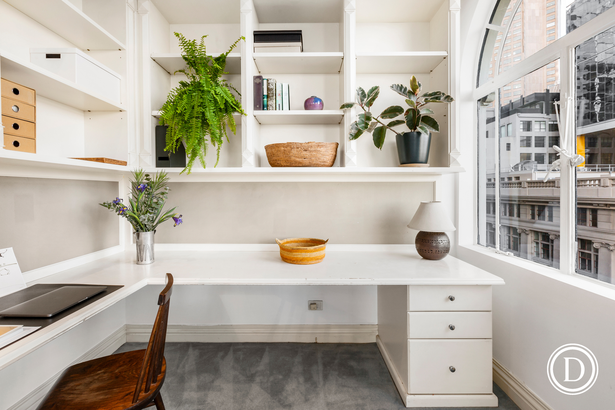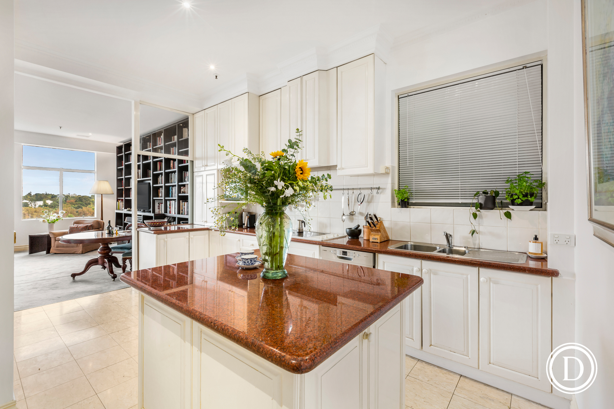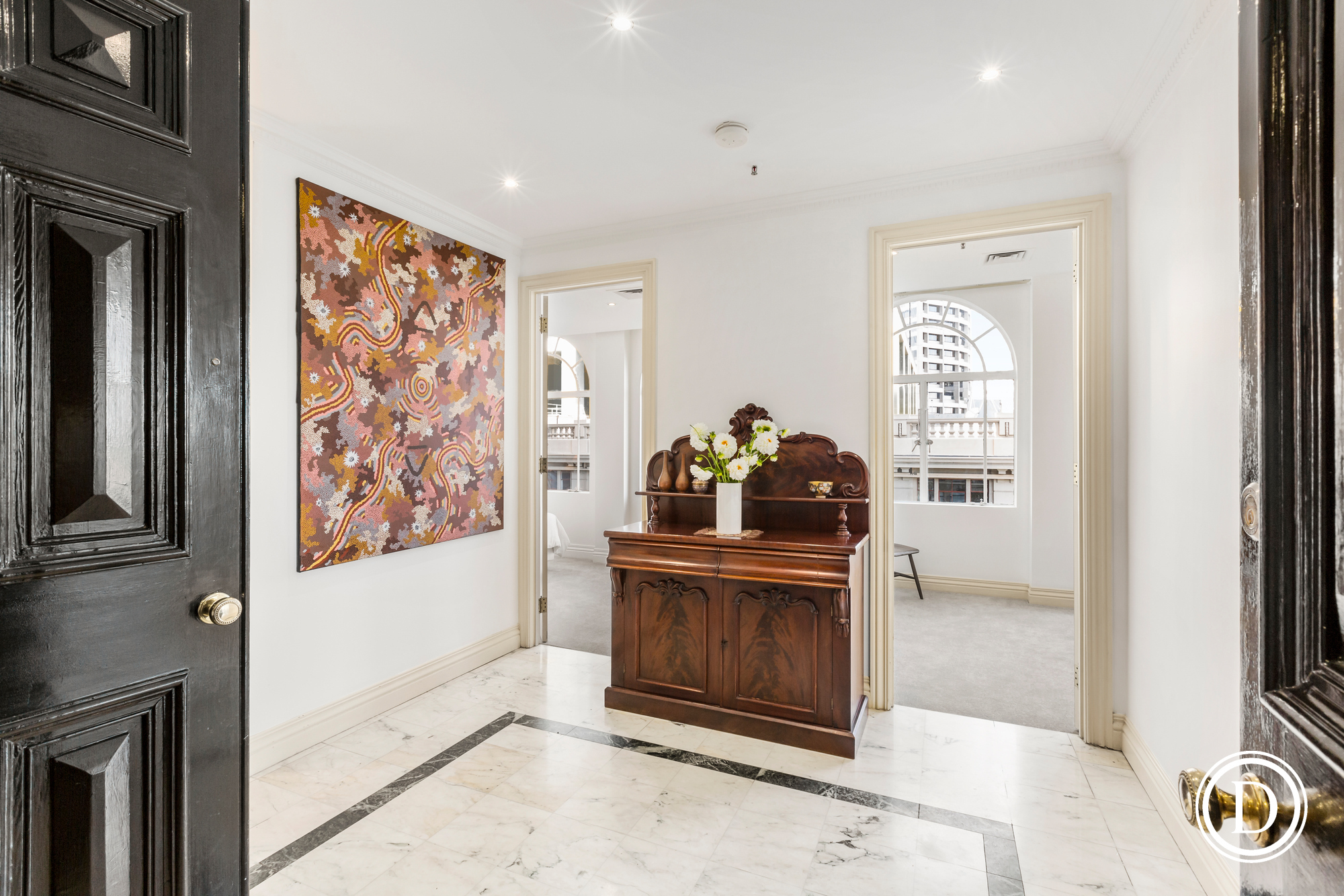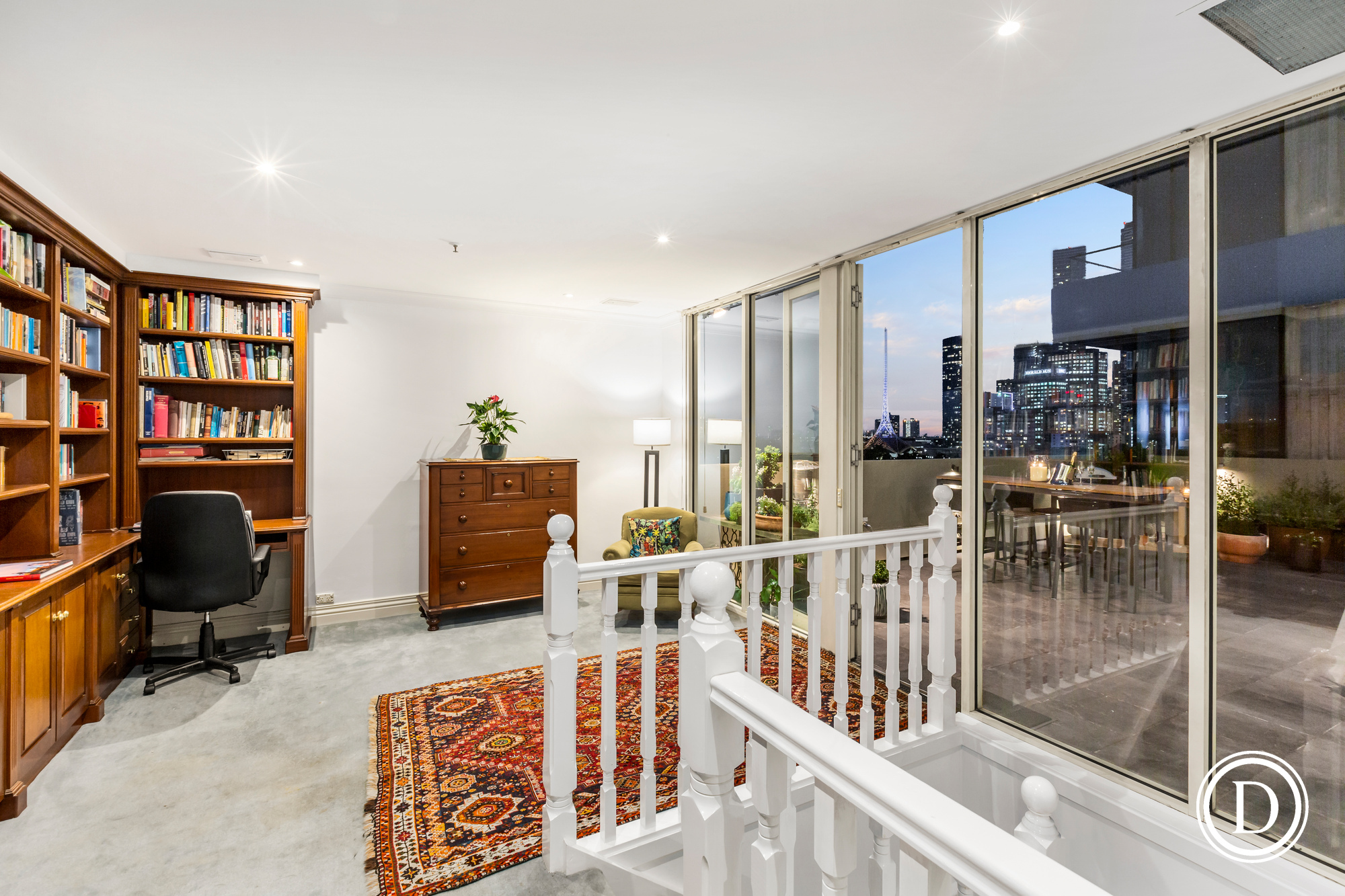 It has three bedrooms, two on the ground floor also with arched windows and marvellous views and marbled ensuites, two fully fitted studies, large granite kitchen with pantry, a separate laundry and marbled powder room. The stately living and dining room with the iconic arched windows, custom storage and panoramic views is made for entertaining on a grand or intimate scale. This city residence also boasts a magnificent outdoor terrace.