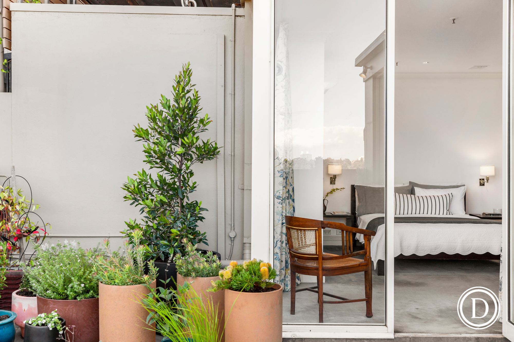 The main bedroom with walk-in wardrobe and marble ensuite also looks out to the terrace and views.