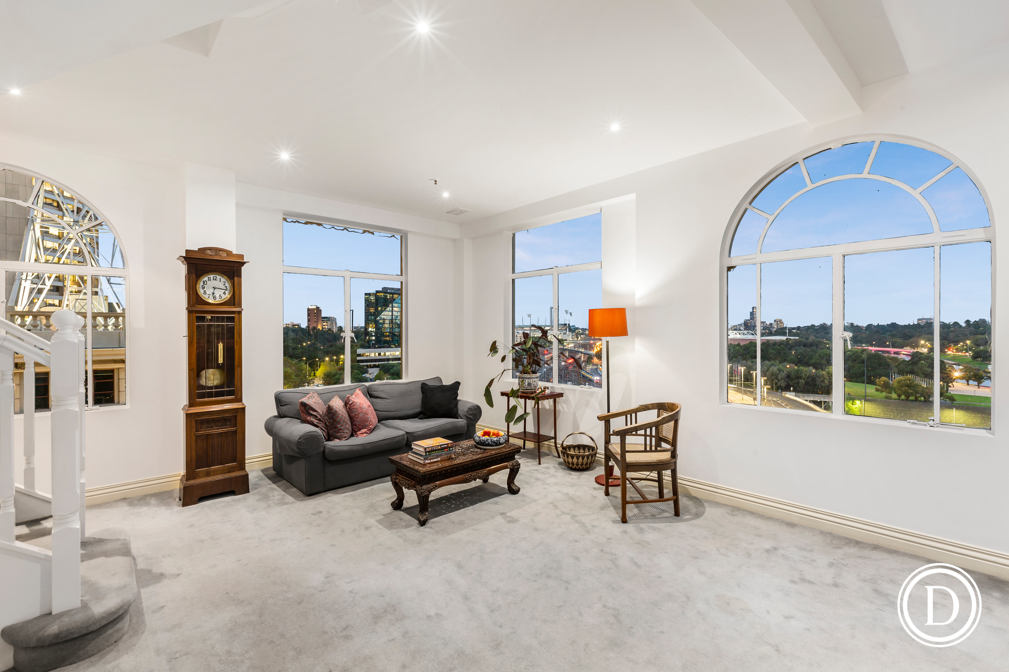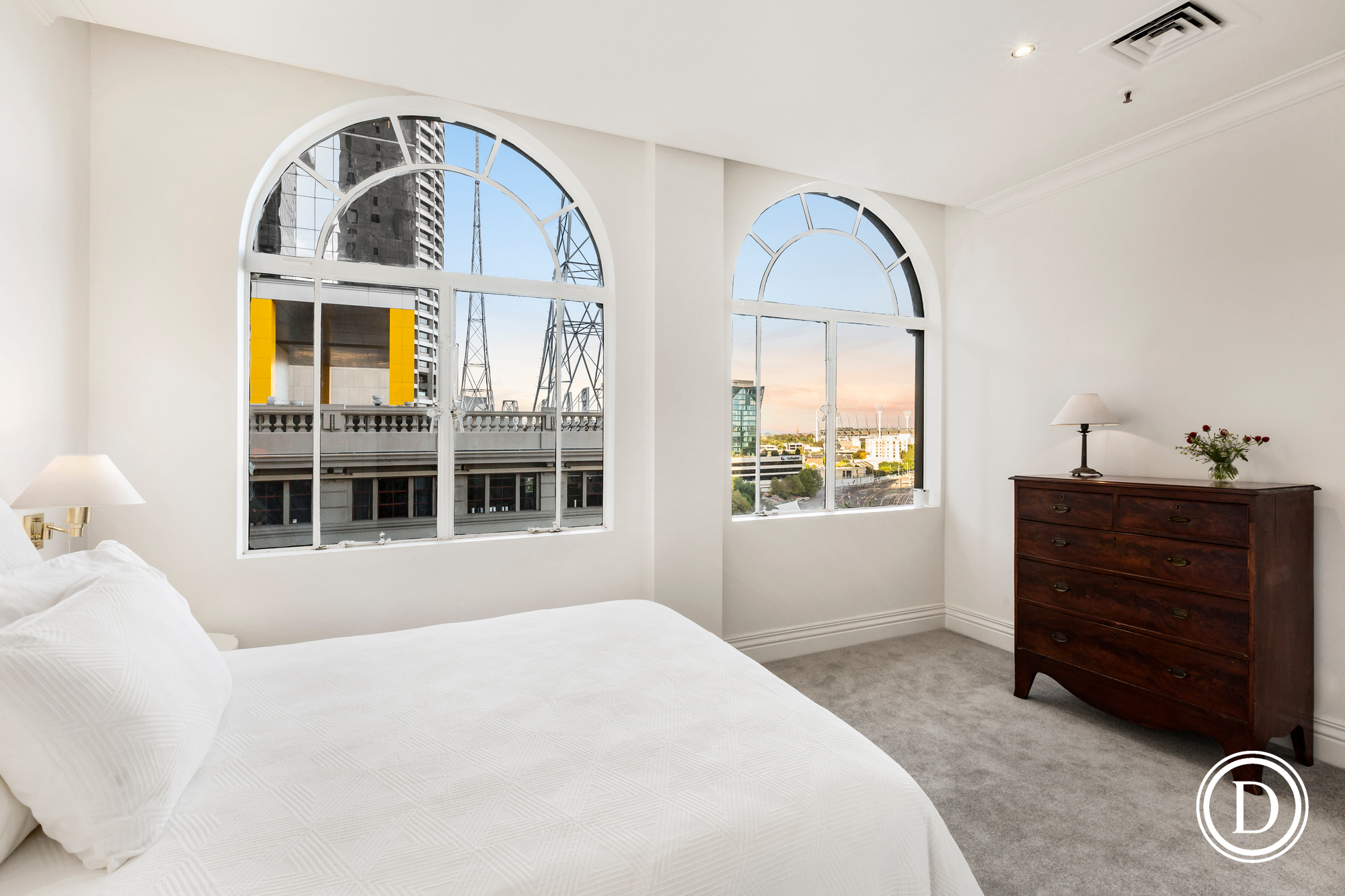 Poised at the gateway to the city and East Melbourne, the penthouse’s signature arched windows offer sweeping vistas of virtually every iconic landmark in Melbourne.