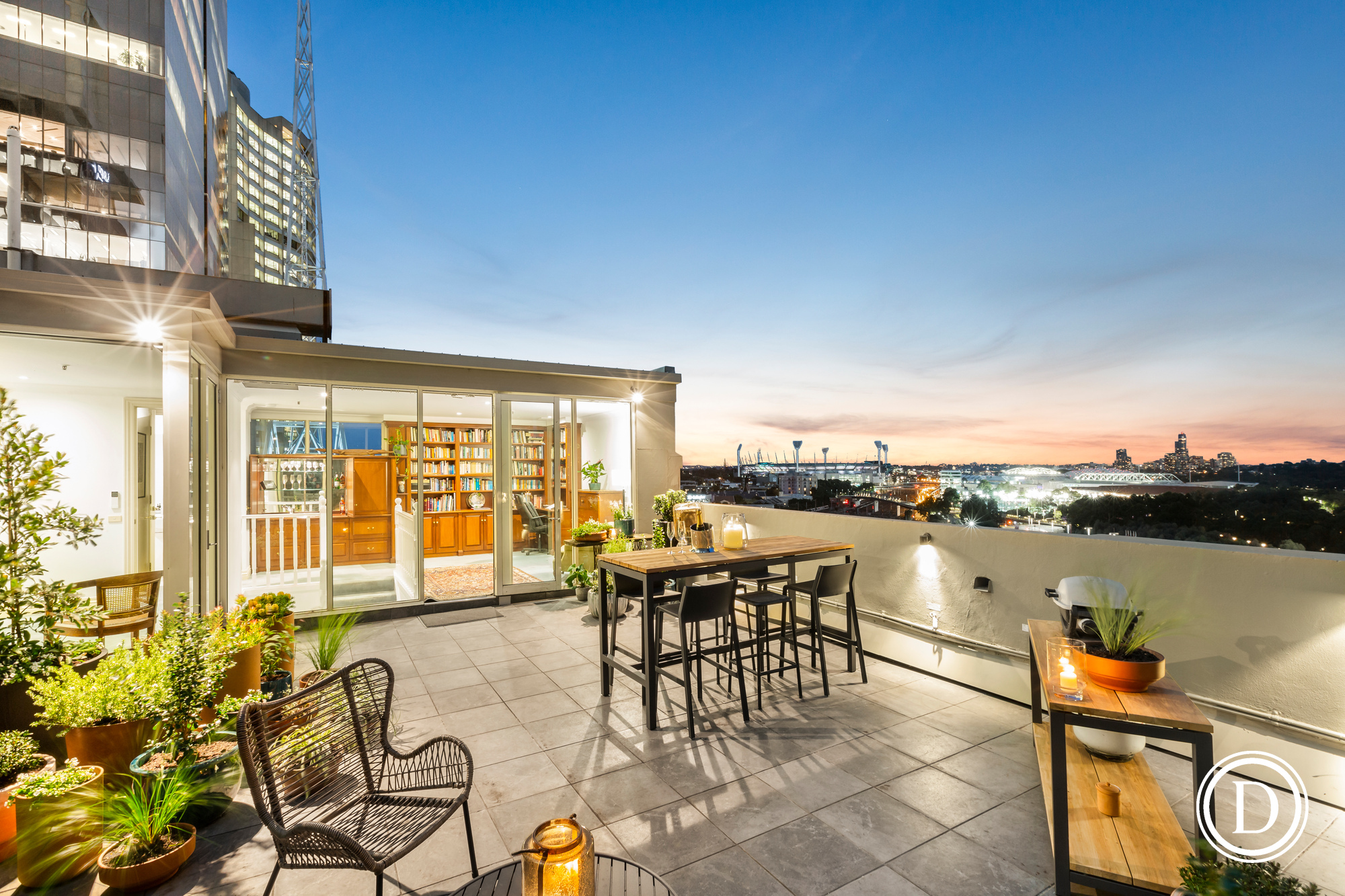 Breathtaking views stretch from the Fitzroy Gardens, past heritage buildings, the Myer Music Bowl, Botanical Gardens to Government House, the MCG and AAMI Stadium, the Yarra River and the Arts Centre spire and Federation Square.