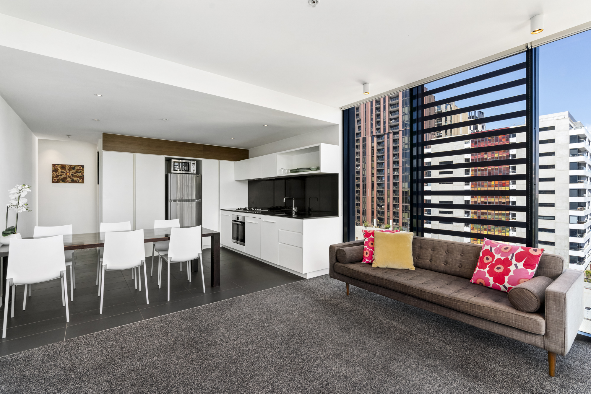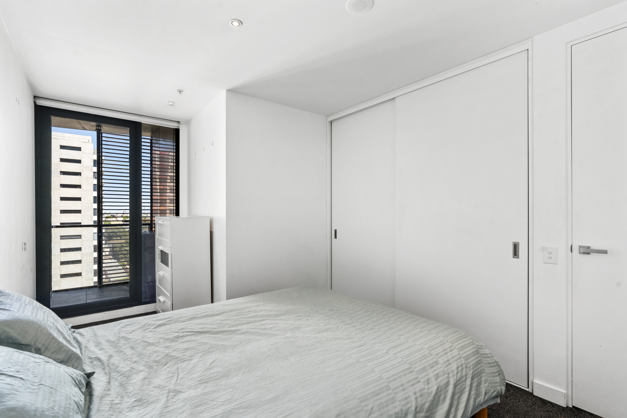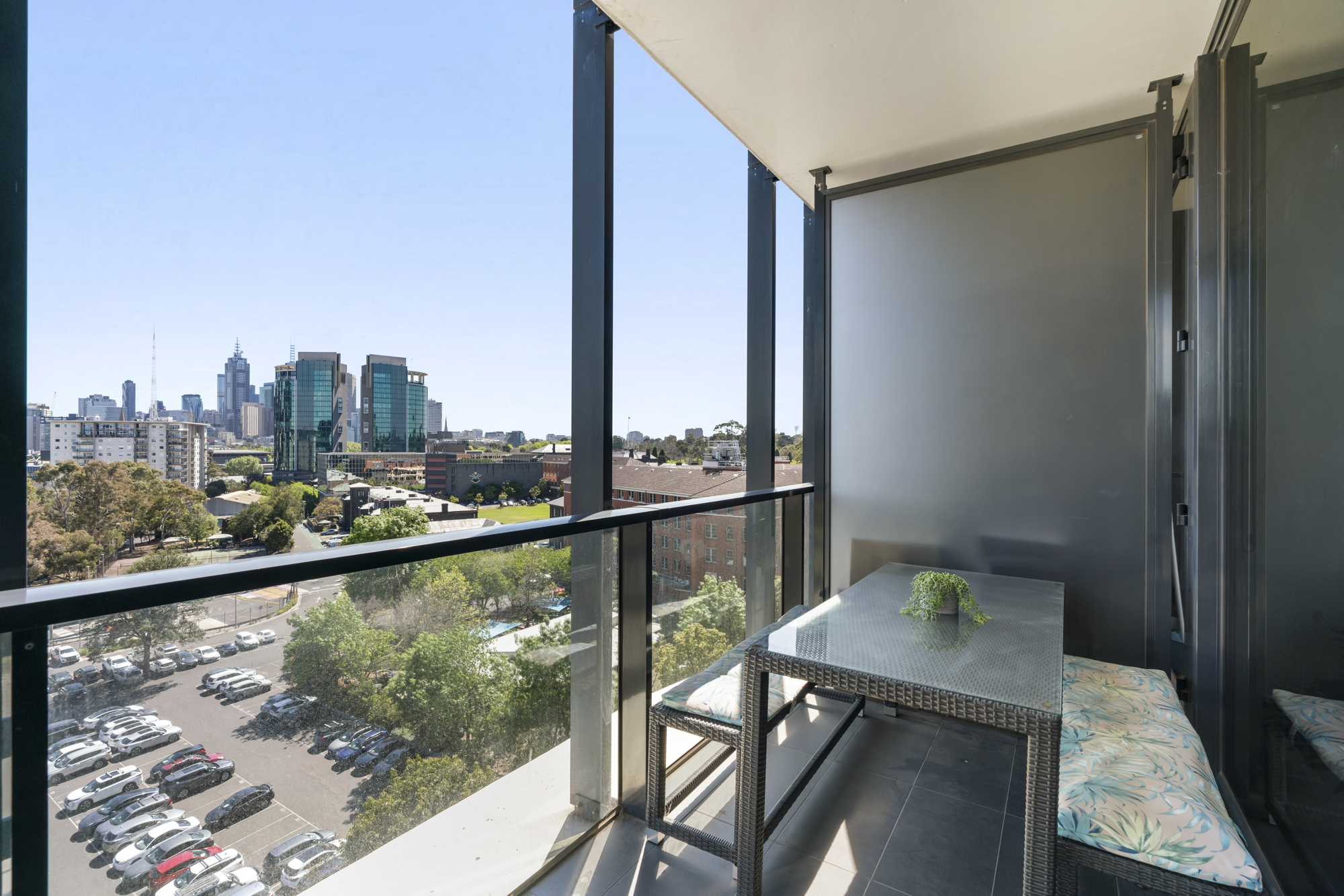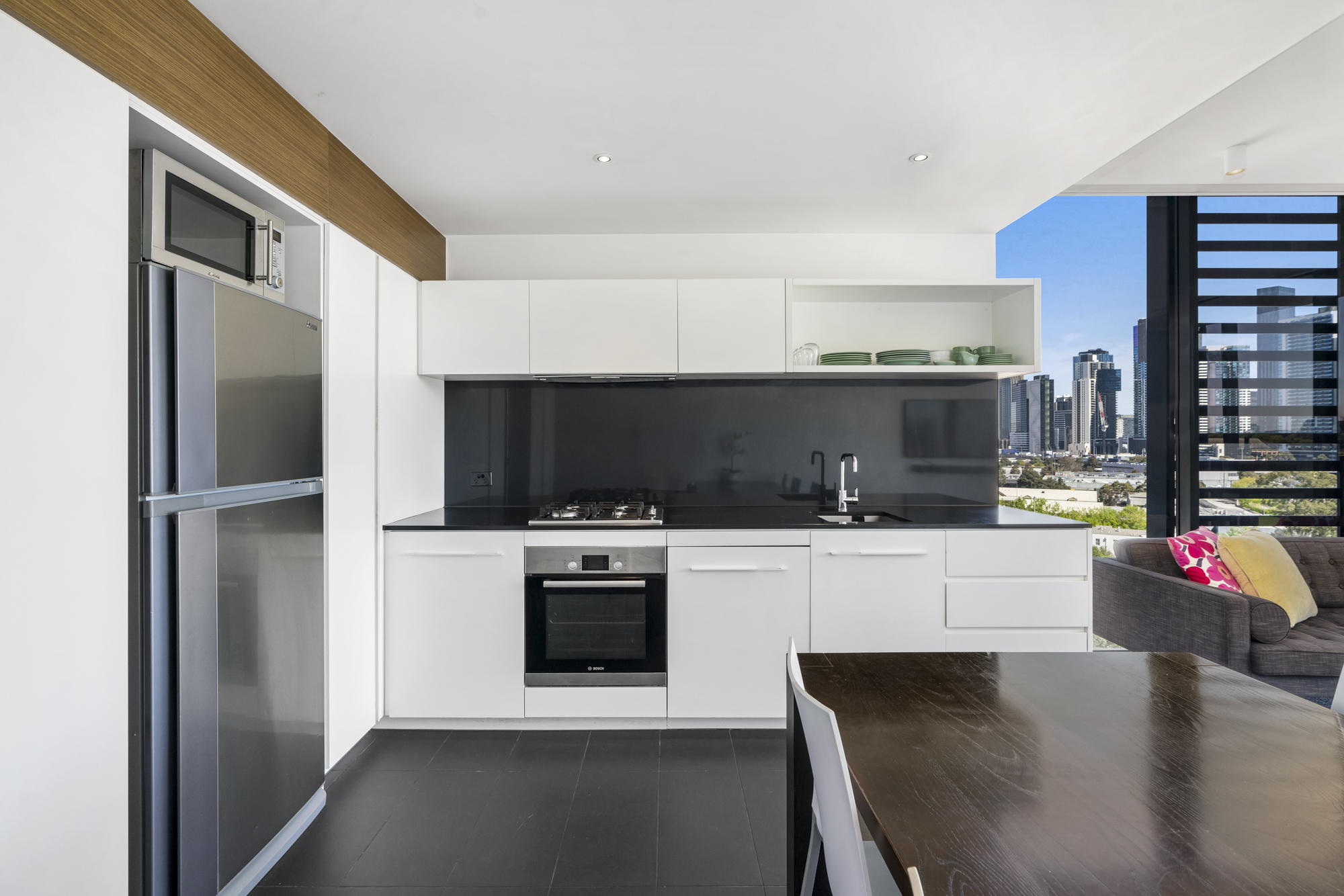 This contemporary two-bedroom apartment immediately impresses with expansive floor-to-ceiling windows in the living area, bathing the space in natural light and framing uninterrupted northern views of Melbourne’s striking city skyline. The living area flows effortlessly onto a private, covered balcony — the perfect vantage point for both morning coffee and evening sunsets.