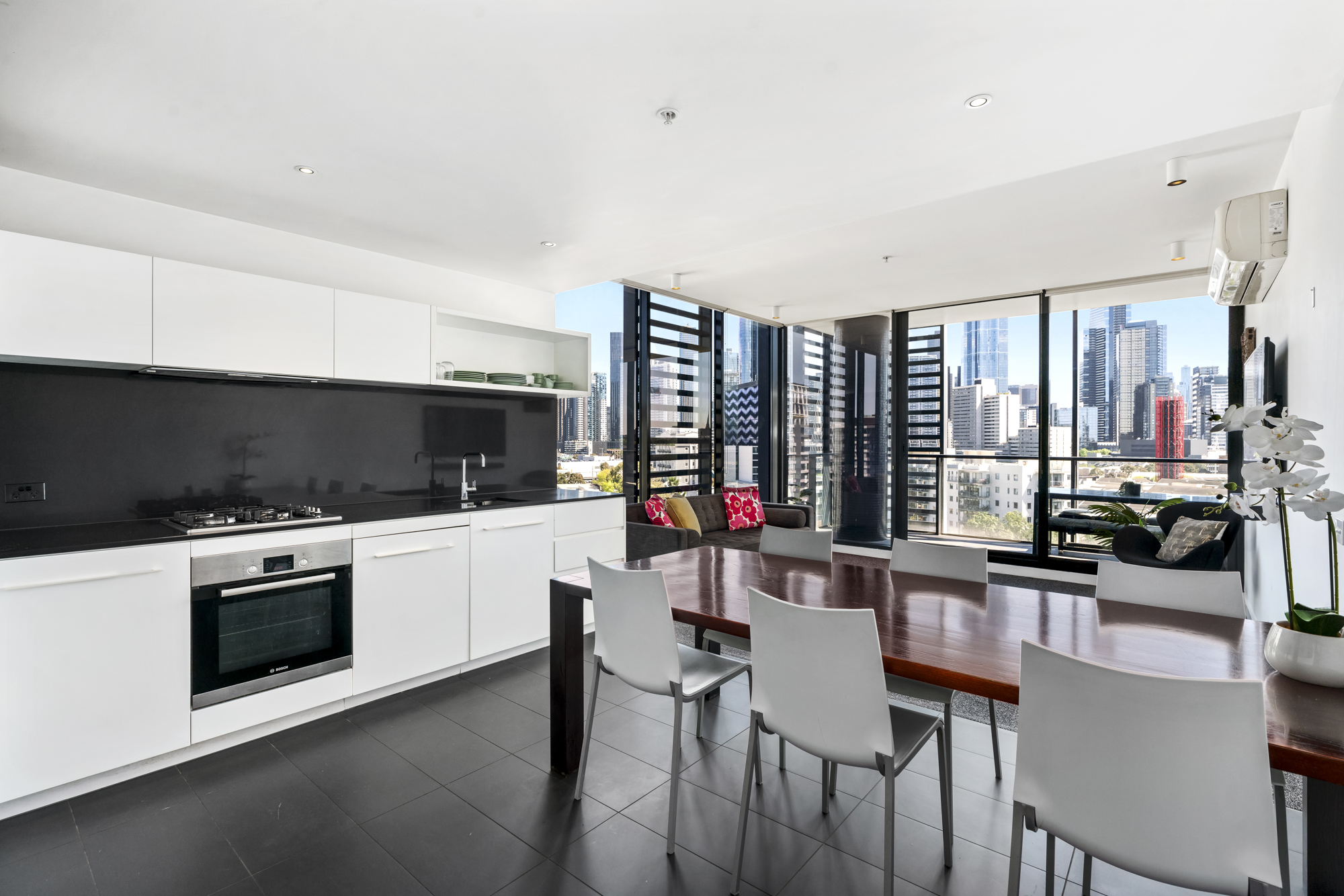 Positioned high on a desirable corner of the building, the apartment features a spacious, light-filled open-plan living and dining area equipped with split-system heating and cooling. The modern kitchen is appointed with premium BOSCH appliances, a dishwasher, and ample storage.
